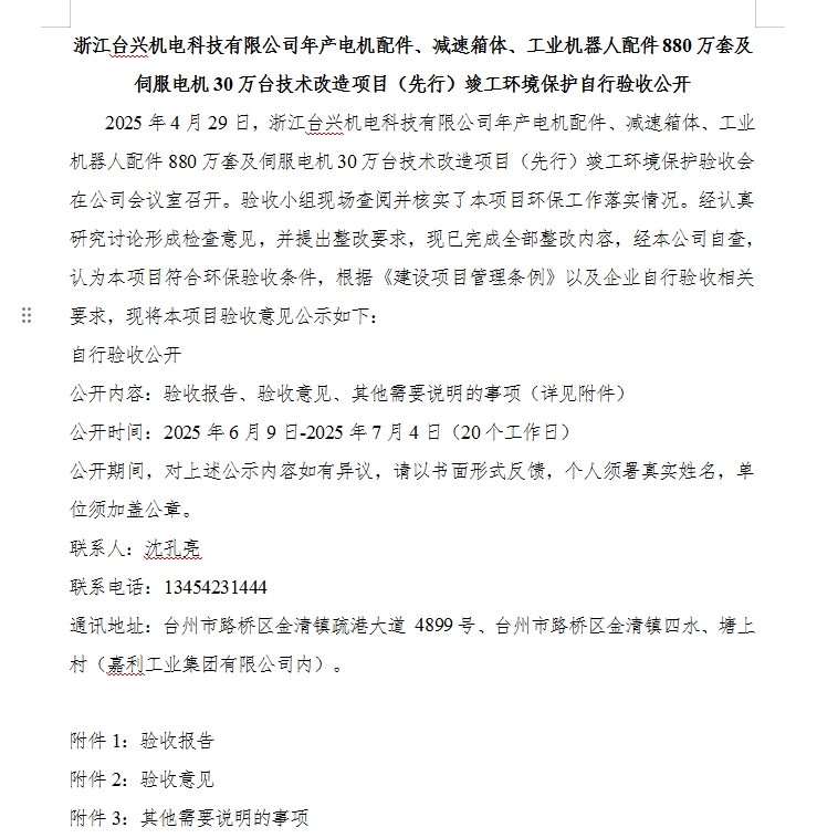 浙江臺興機電科技有限公司年產(chǎn)電機配件、減速箱體、工業(yè)機器人配件880萬套及伺服電機30萬臺技術(shù)改造項目(先行)竣工環(huán)境保護自行驗收公開